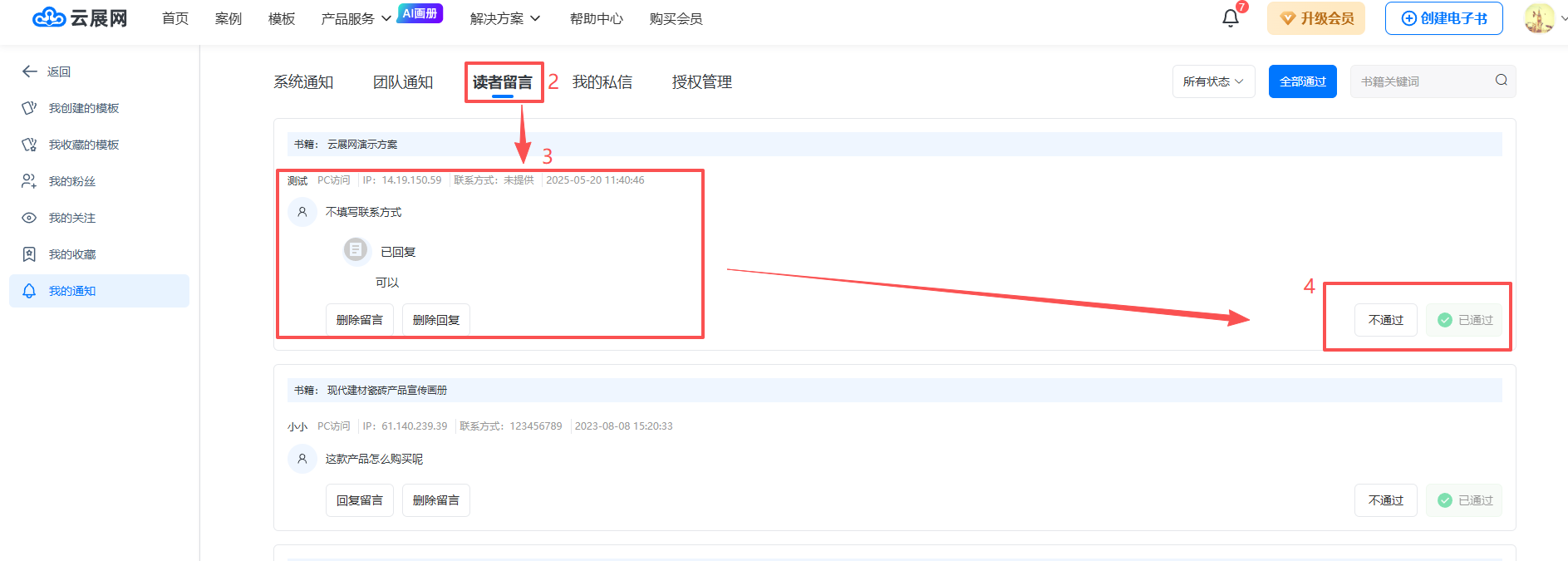 在工作臺頁面,點擊右上角的【🔔】圖標,打開【我的通知】頁面,再點擊【讀者留言】,即可看到讀者留下的留言、姓名及聯(lián)系方式。在右側(cè)選擇通過或不通過即可。