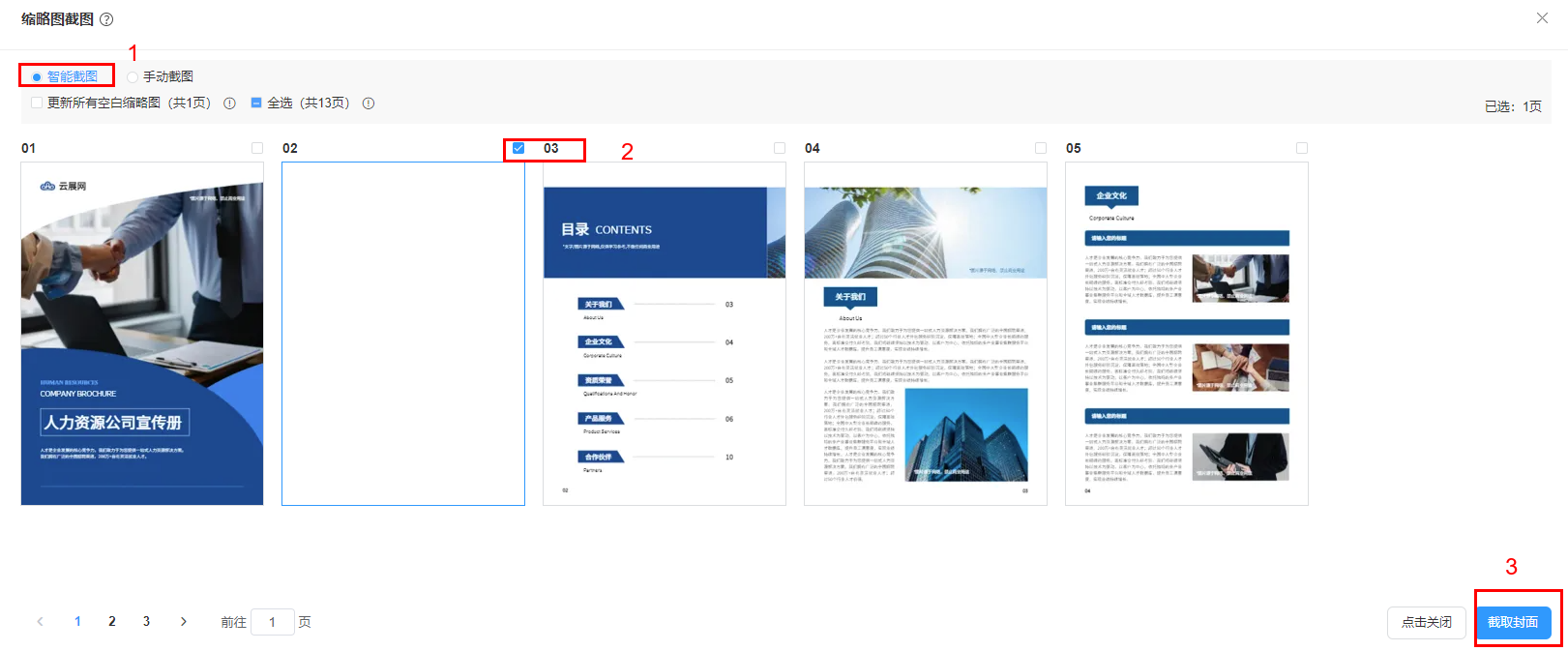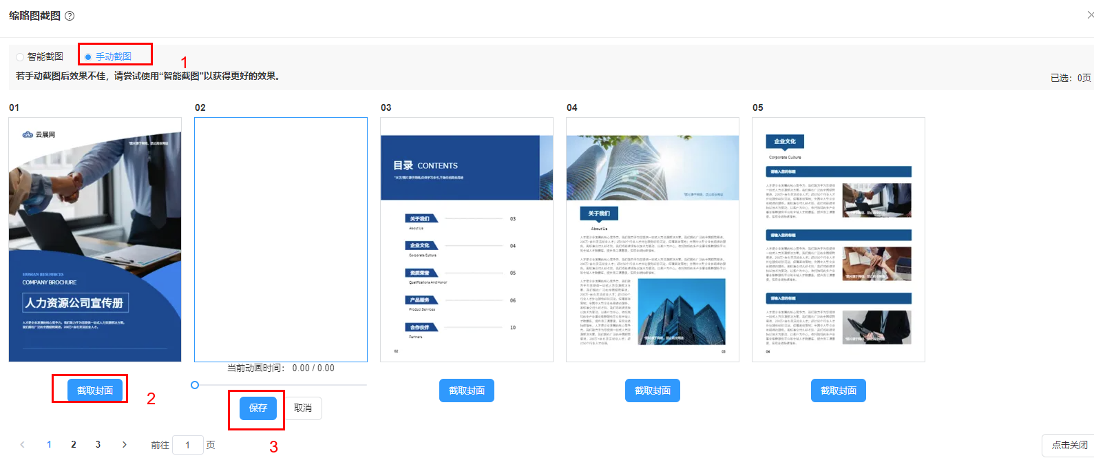 選擇【手動(dòng)截圖】,點(diǎn)擊每張頁(yè)面下方的【截取封面】,并點(diǎn)擊保存,即可完成截圖。