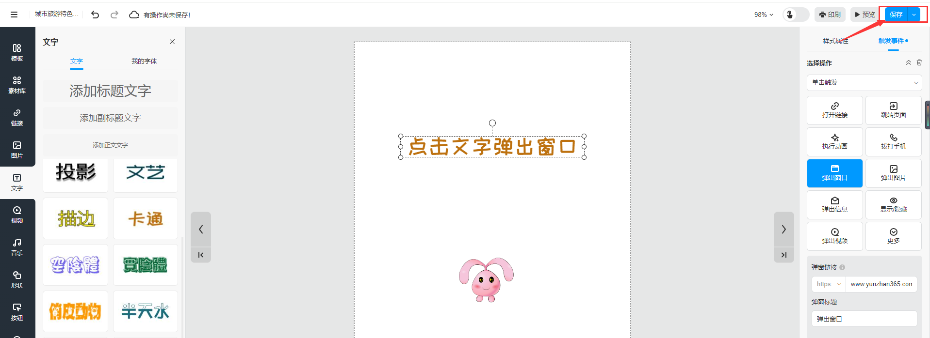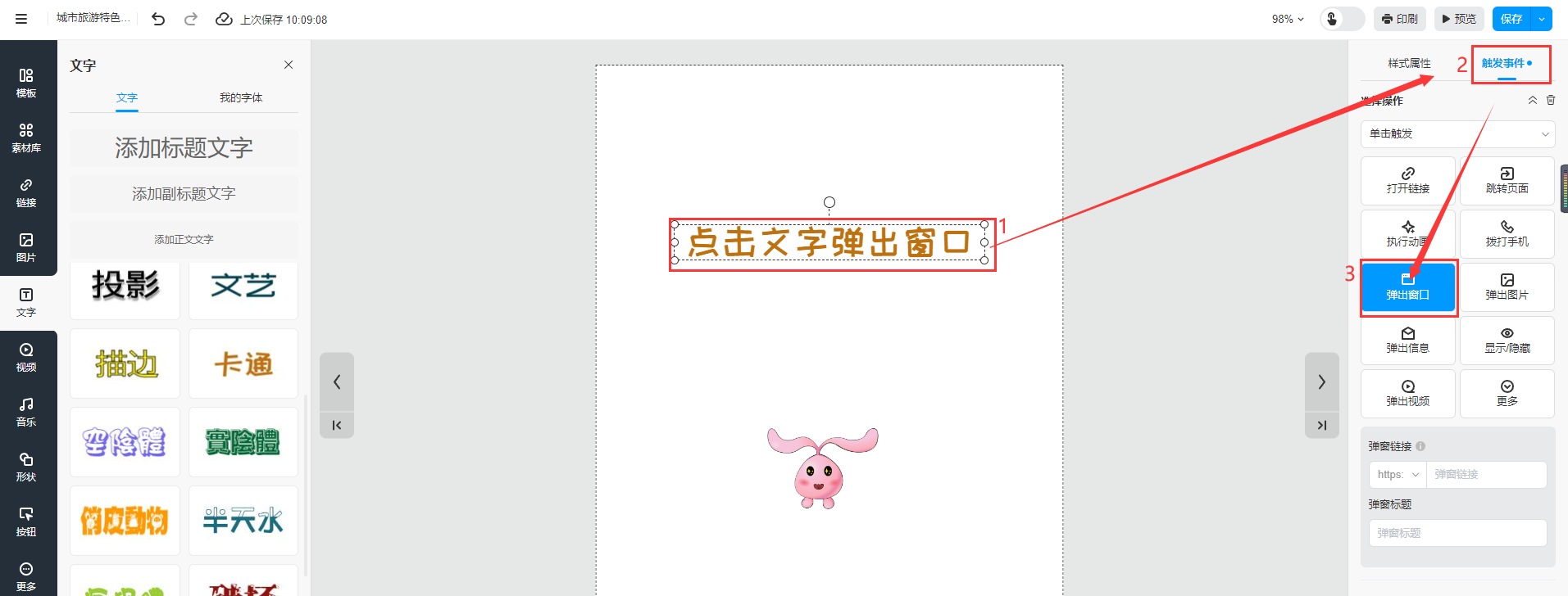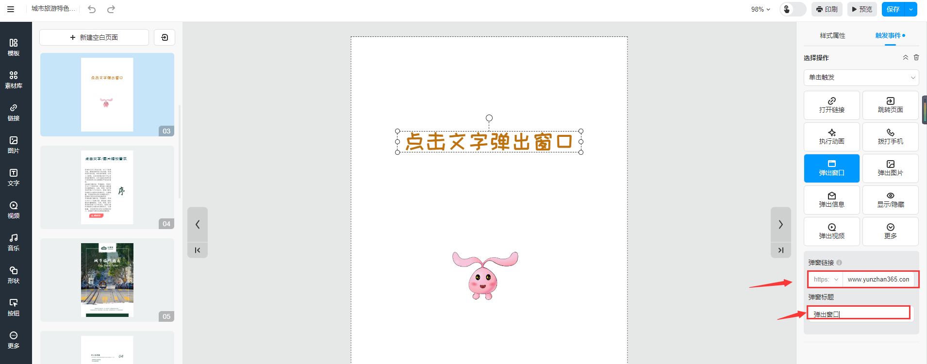 選中需要彈出窗口的文字或者圖片,然后點(diǎn)擊【觸發(fā)事件】選擇【彈出窗口】