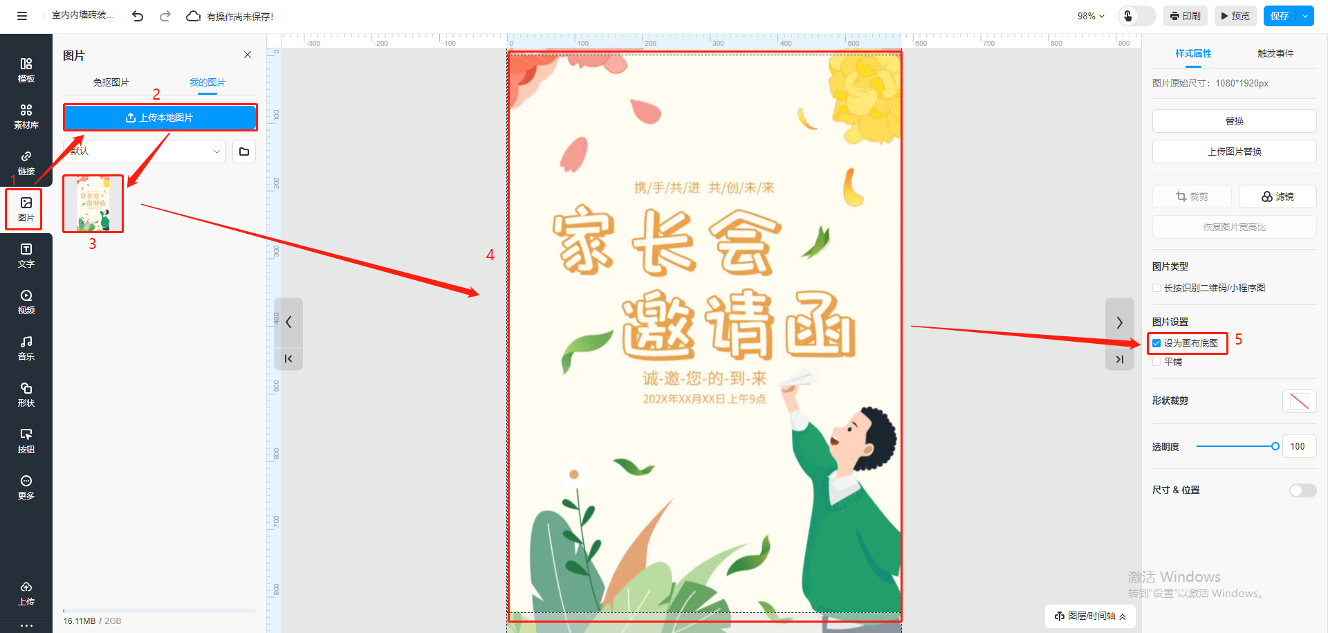 選擇【圖片】,點(diǎn)擊【上傳本地圖片】上傳圖片,點(diǎn)擊上傳好的圖片添加到頁面中,勾選【設(shè)為畫布底圖】。