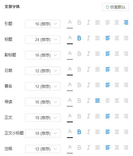 文章設(shè)置,可以對文章的頭尾部展示圖,字體大小,間距,熱區(qū)顏色進行配置。