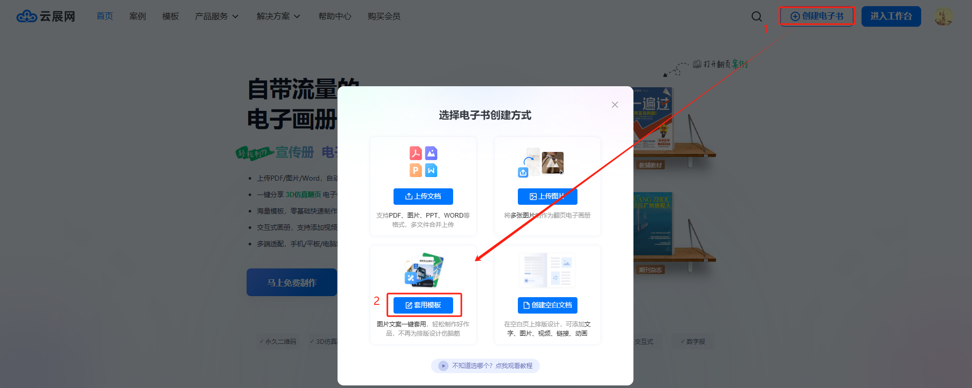 點擊右上角【創(chuàng)建電子書】,然后點擊【套用模板】,進入模板中心。
