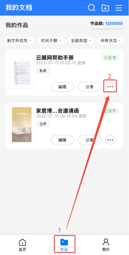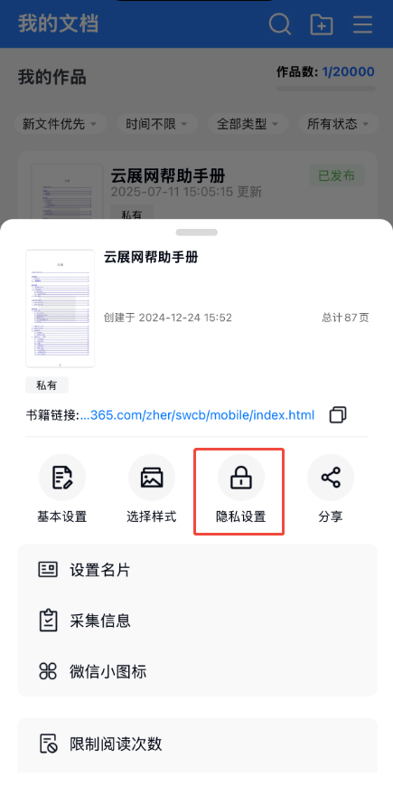打開(kāi)云展app,點(diǎn)擊【作品】,點(diǎn)擊書(shū)本旁邊三個(gè)點(diǎn),然后點(diǎn)擊【隱私設(shè)置】。