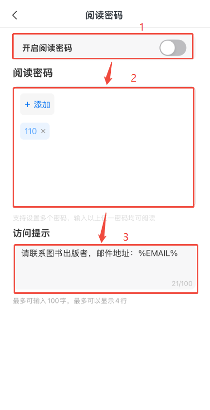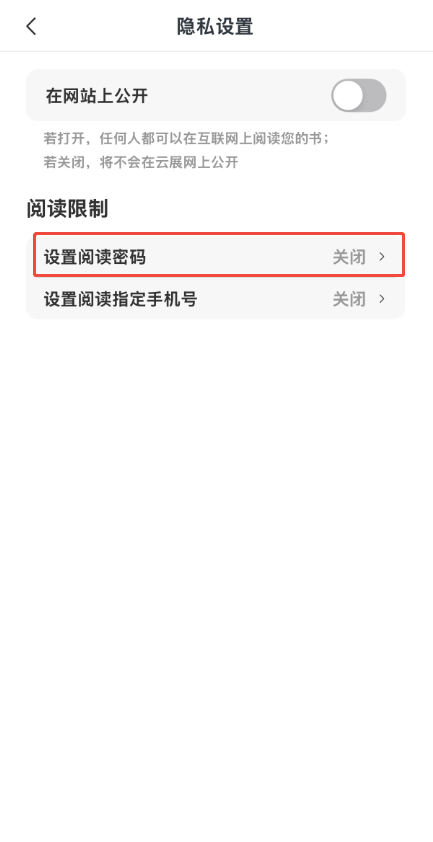 點(diǎn)擊【設(shè)置閱讀密碼】,將【開(kāi)啟閱讀密碼】打開(kāi),在下方密碼框輸入密碼,可以輸入一個(gè)或者多個(gè),也可以根據(jù)自己需要設(shè)置訪問(wèn)提示,設(shè)置完點(diǎn)左上角箭頭退出即可。
