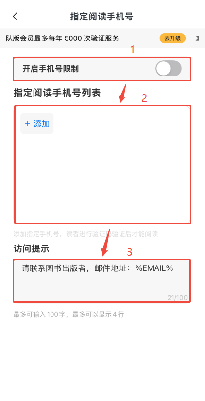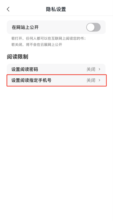 點(diǎn)擊【設(shè)置閱讀指定手機(jī)號(hào)】,將【開(kāi)啟手機(jī)號(hào)限制】打開(kāi),在下方手機(jī)號(hào)列表框輸入手機(jī)號(hào),可以輸入一個(gè)或者多個(gè),也可以根據(jù)自己需要設(shè)置訪問(wèn)提示,設(shè)置完點(diǎn)左上角箭頭退出即可。