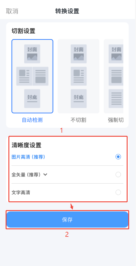 點(diǎn)擊右上角【轉(zhuǎn)換設(shè)置】,然后在【清晰度設(shè)置】選擇合適的清晰度類型后,點(diǎn)擊【保存】即可。