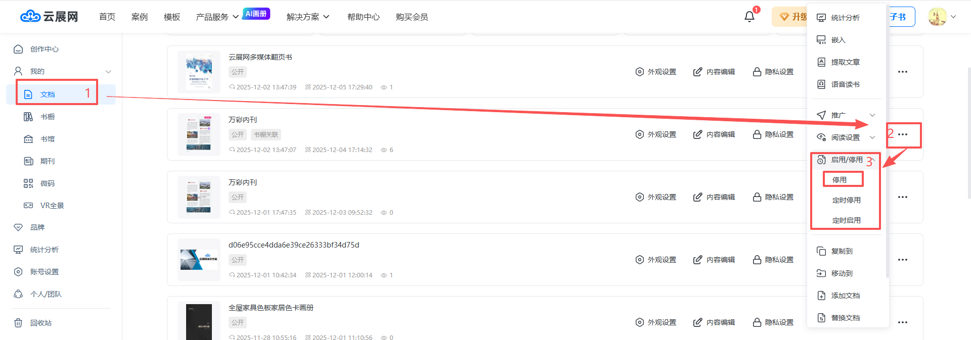 在【文檔】頁面,選擇需停用的電子書,點擊【…】,選擇【啟用/停用】中的【停用】即可停用該電子書。