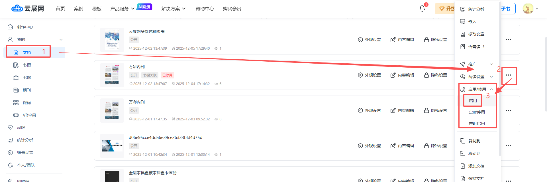 在【文檔】頁面,選擇需啟用的電子書,選擇【啟用/停用】中的【啟用】即可啟用該電子書。