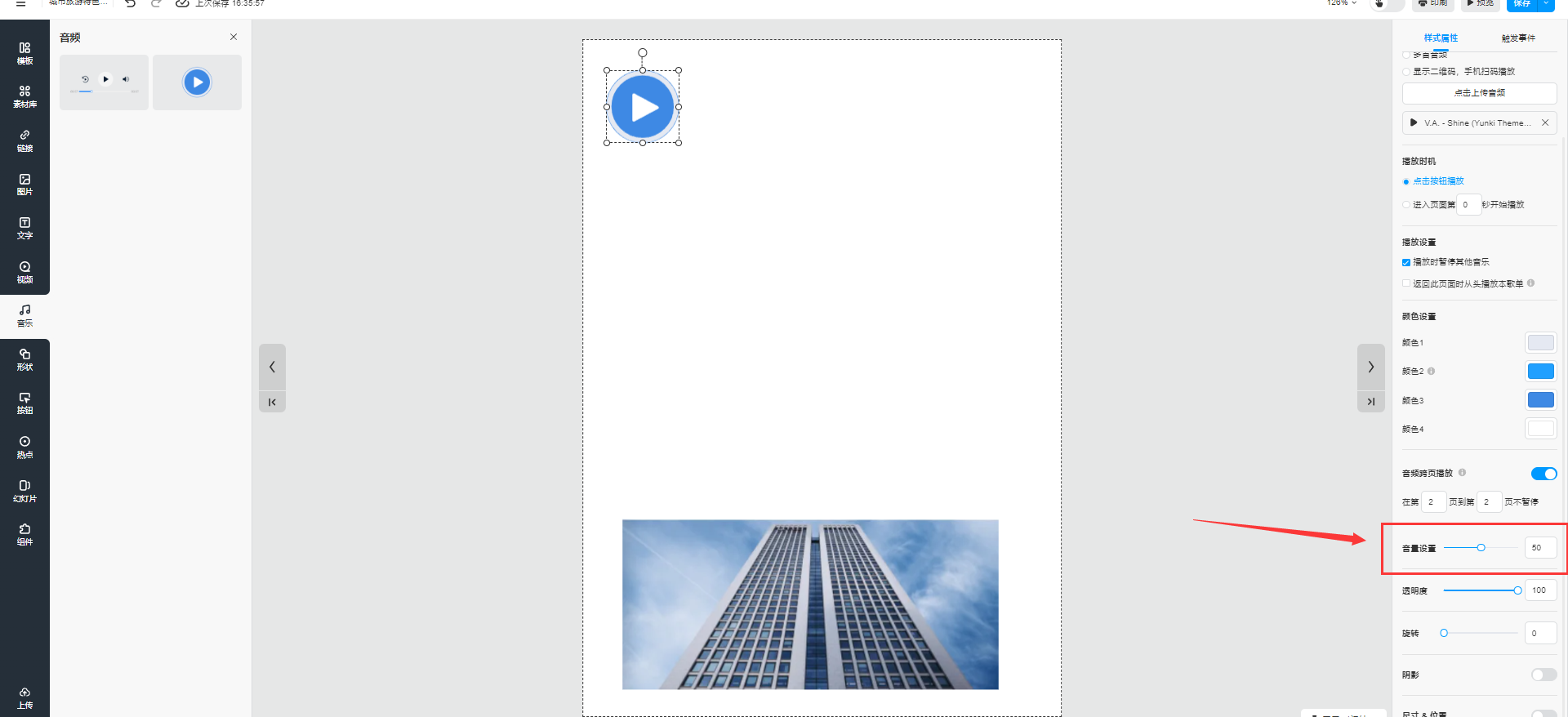 點擊【音樂】選擇音樂控件添加到頁面上,然后點擊【樣式屬性】,點擊【上傳音頻】,上傳mp3格式的音樂文件