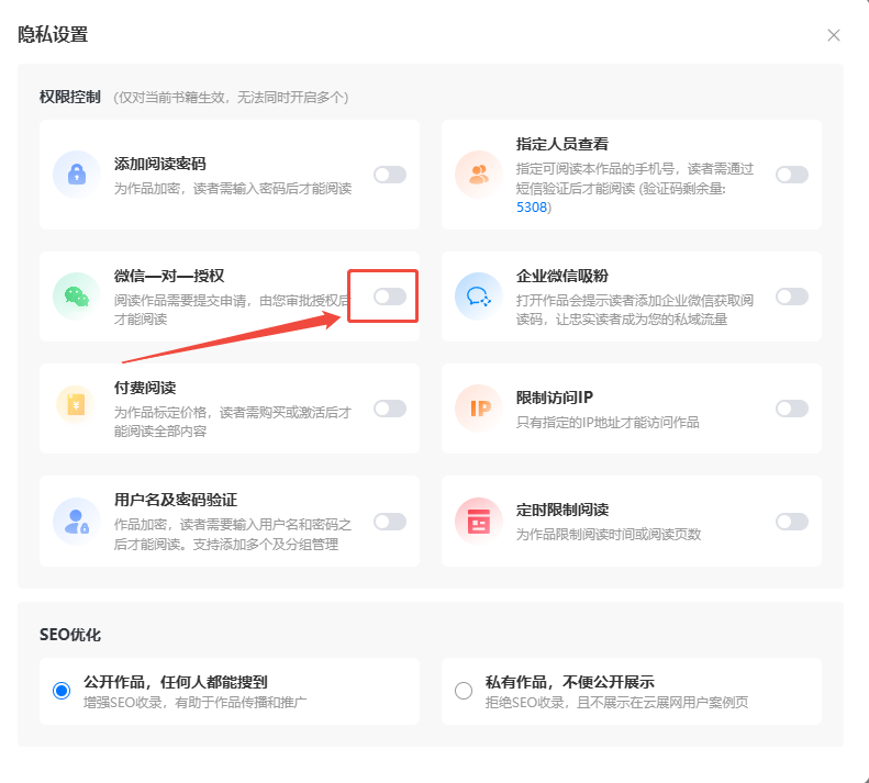 如果你想增強(qiáng)電子書和書櫥的安全性和理解潛在用戶信息,你可以設(shè)置微信一對一授權(quán)。