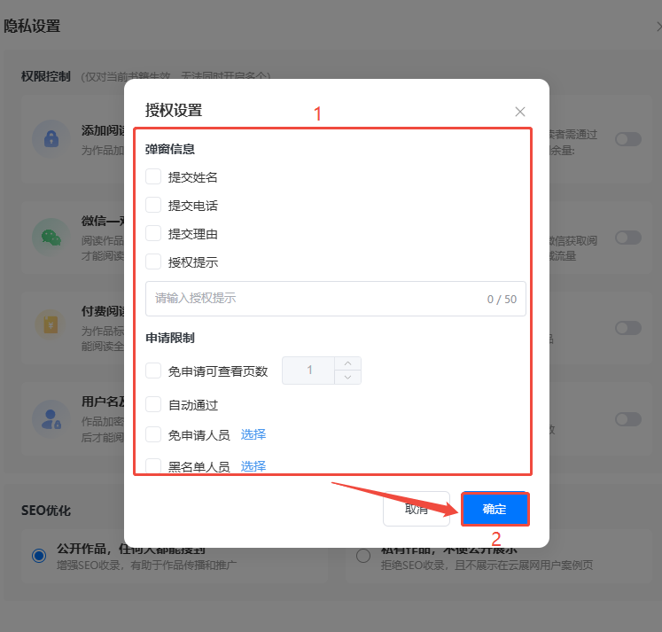 • 彈窗信息:就是讀者打開書本/書櫥,彈出窗口顯示的文字信息。勾選提交姓名/提交電話/理由讓讀者填寫,方便您判斷這個讀者是否可以查看書本/書櫥,授權(quán)提示可以寫一下聯(lián)系方式,用于提示讀者如何聯(lián)系您
