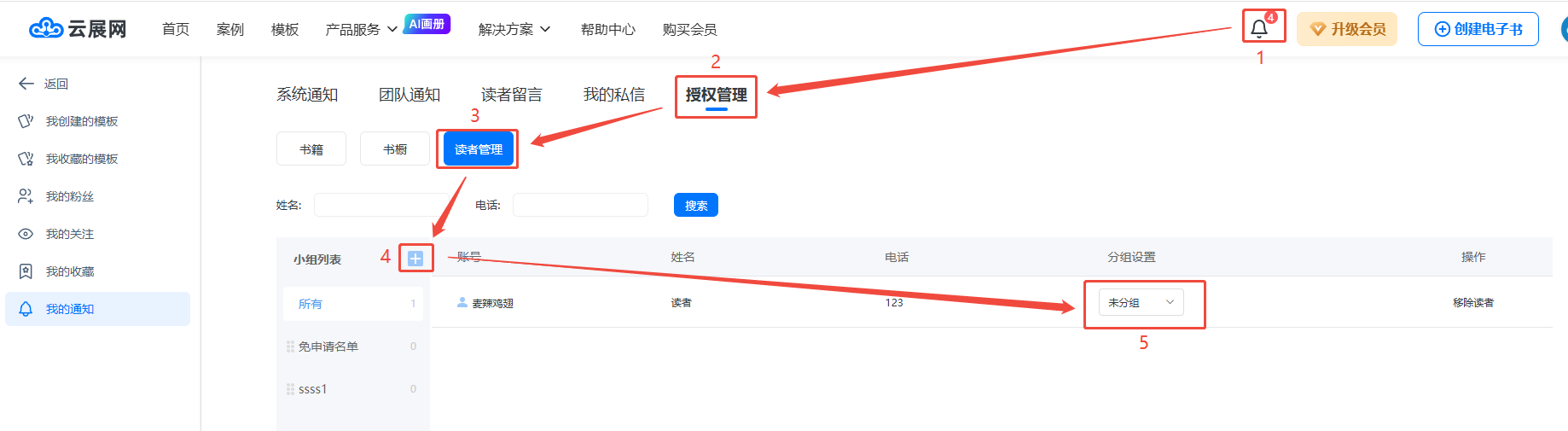 讀者申請后,點(diǎn)擊右上角的鈴鐺圖標(biāo),然后點(diǎn)擊【授權(quán)管理】,再點(diǎn)擊【+】創(chuàng)建小組,最后在對應(yīng)讀者的【分組設(shè)置】里進(jìn)行分組。