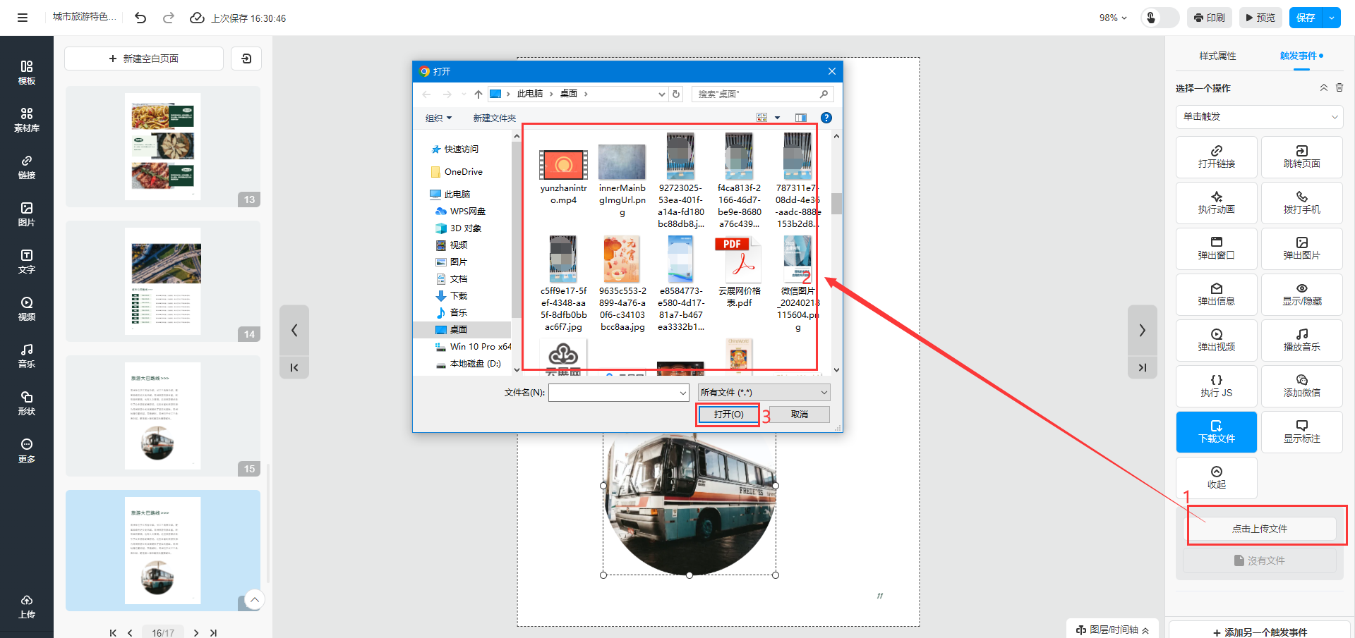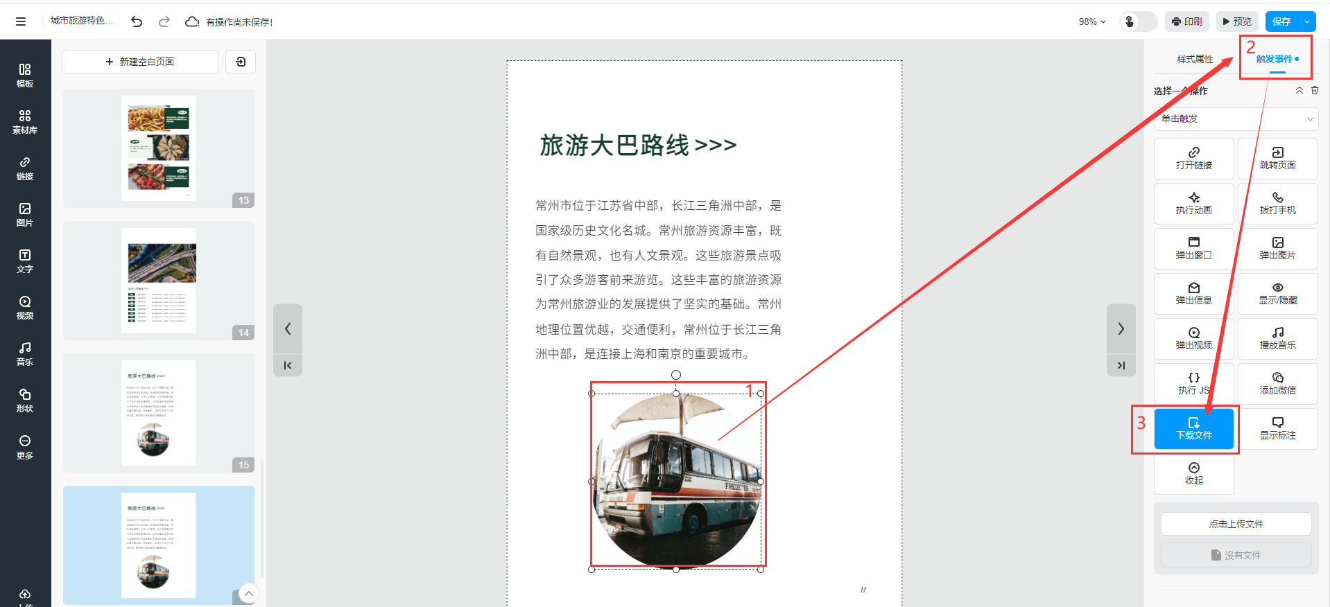 選中需要添加附件的文字或者圖片,點擊【觸發(fā)事件】,選擇【下載文件】