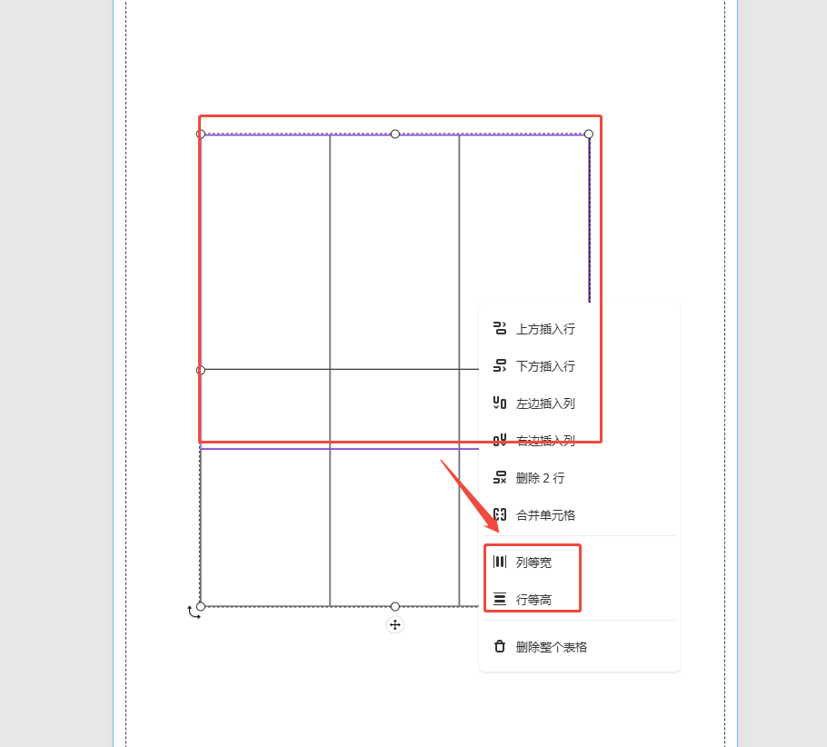 如果感覺每一行的高度或者每一列的寬度不統(tǒng)一,可以先選中整個表格,然后按住鍵盤上的ctrl鍵,單擊鼠標(biāo)左鍵選擇單元格,被選中的單元格周圍會有一圈紫色的,最后右鍵選擇【列等寬】/【行等高】即可自動調(diào)整。
