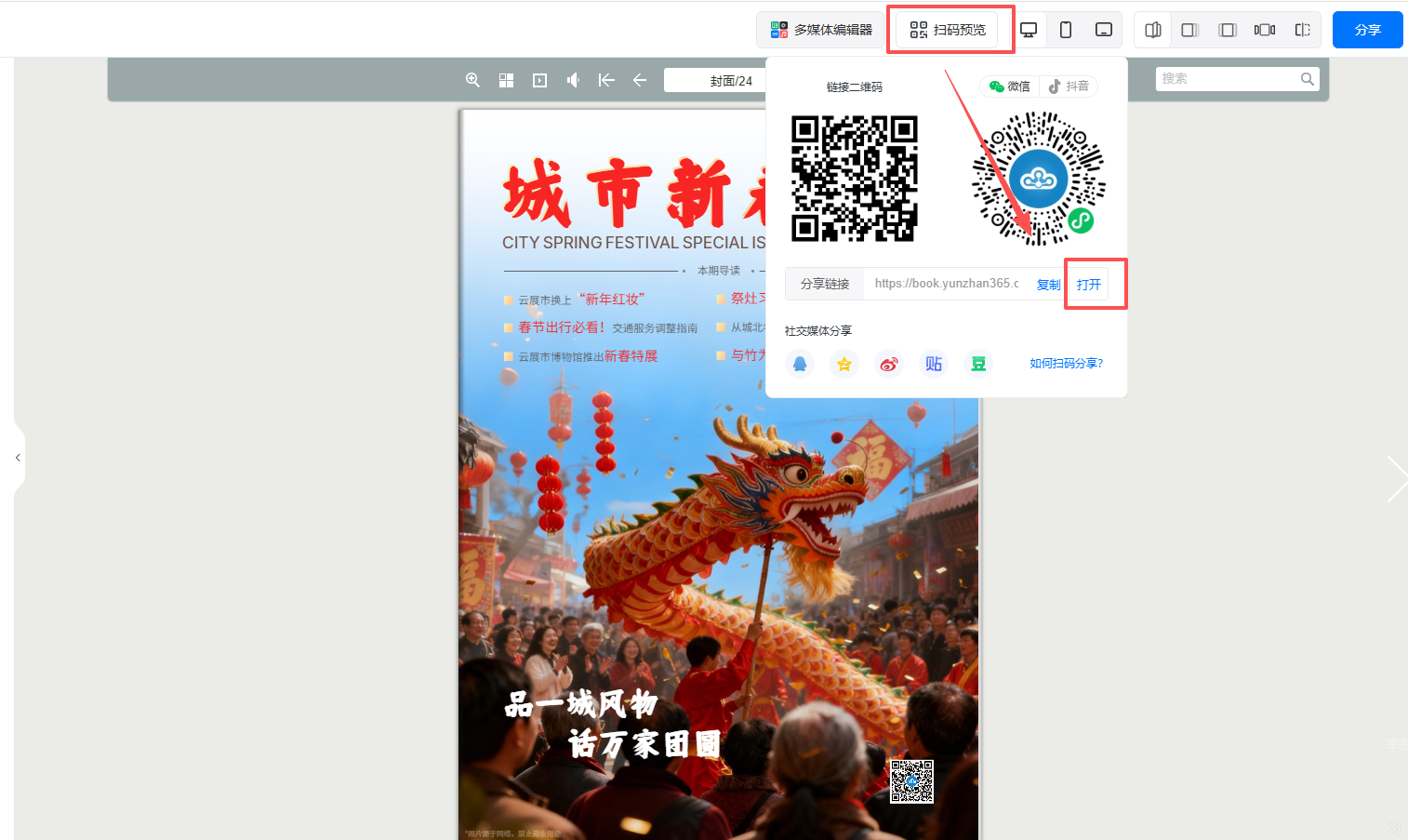 將鼠標(biāo)懸停在【掃碼預(yù)覽】,選擇【打開】查看預(yù)覽效果。