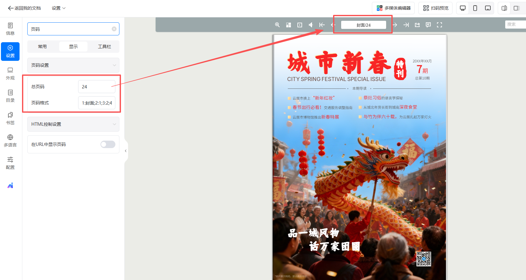 操作步驟:如輸入總頁(yè)碼“24”;頁(yè)碼格式“1:封面;2:1;3:2;4:3;5-11:4+;24:封底”,即可如常規(guī)書籍一樣封面封底顯示文字,中間顯示頁(yè)碼。
