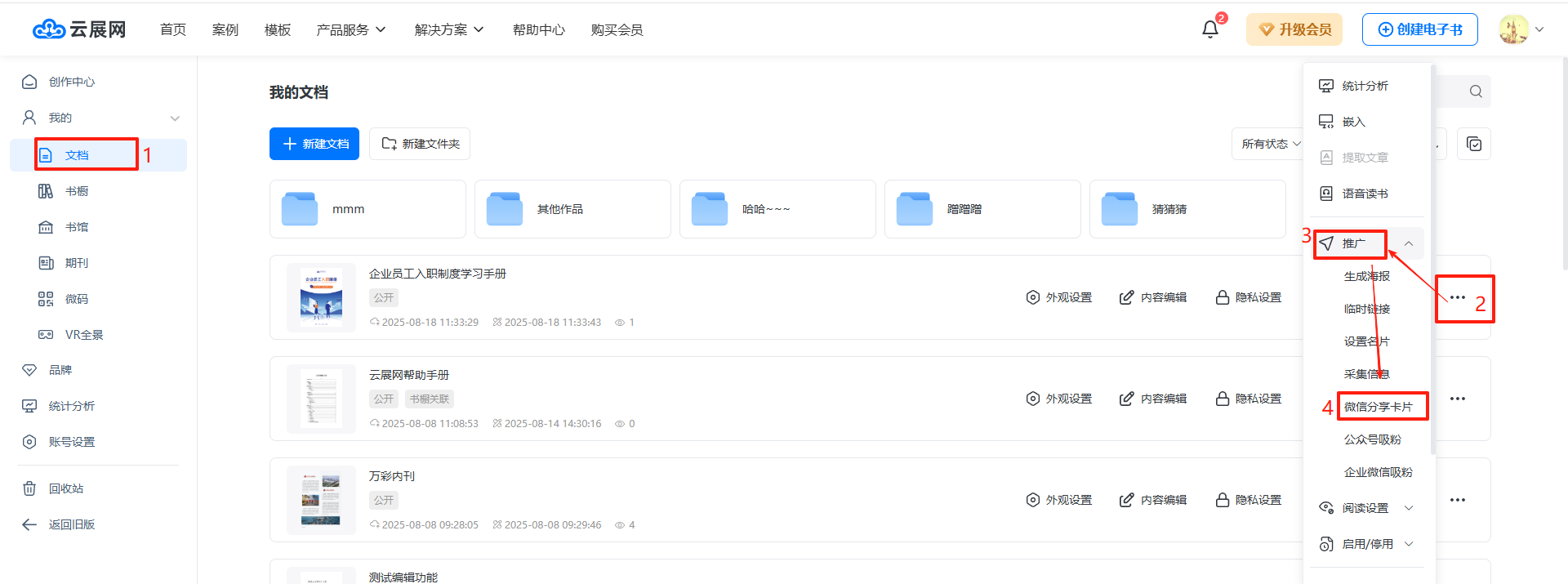 在【文檔】頁面右側(cè),點(diǎn)擊“…”三個點(diǎn)按鈕,點(diǎn)擊【推廣】,隨后點(diǎn)擊【微信分享卡片】