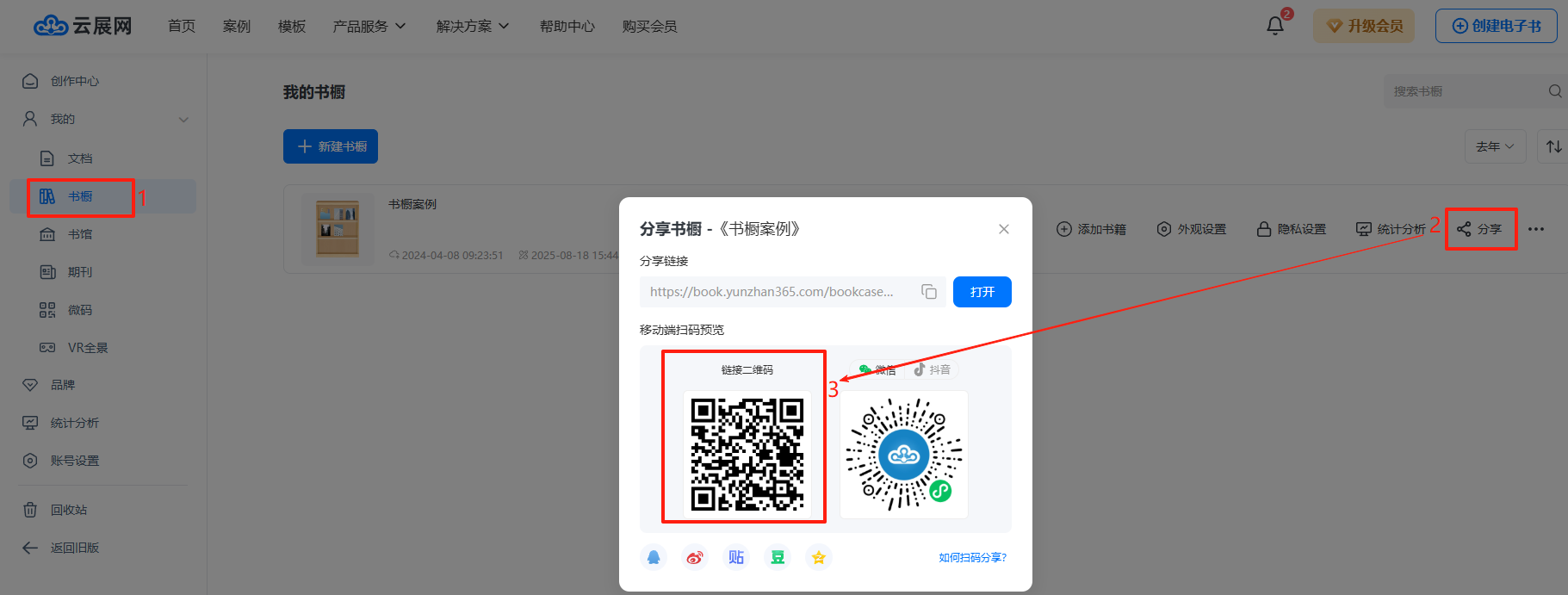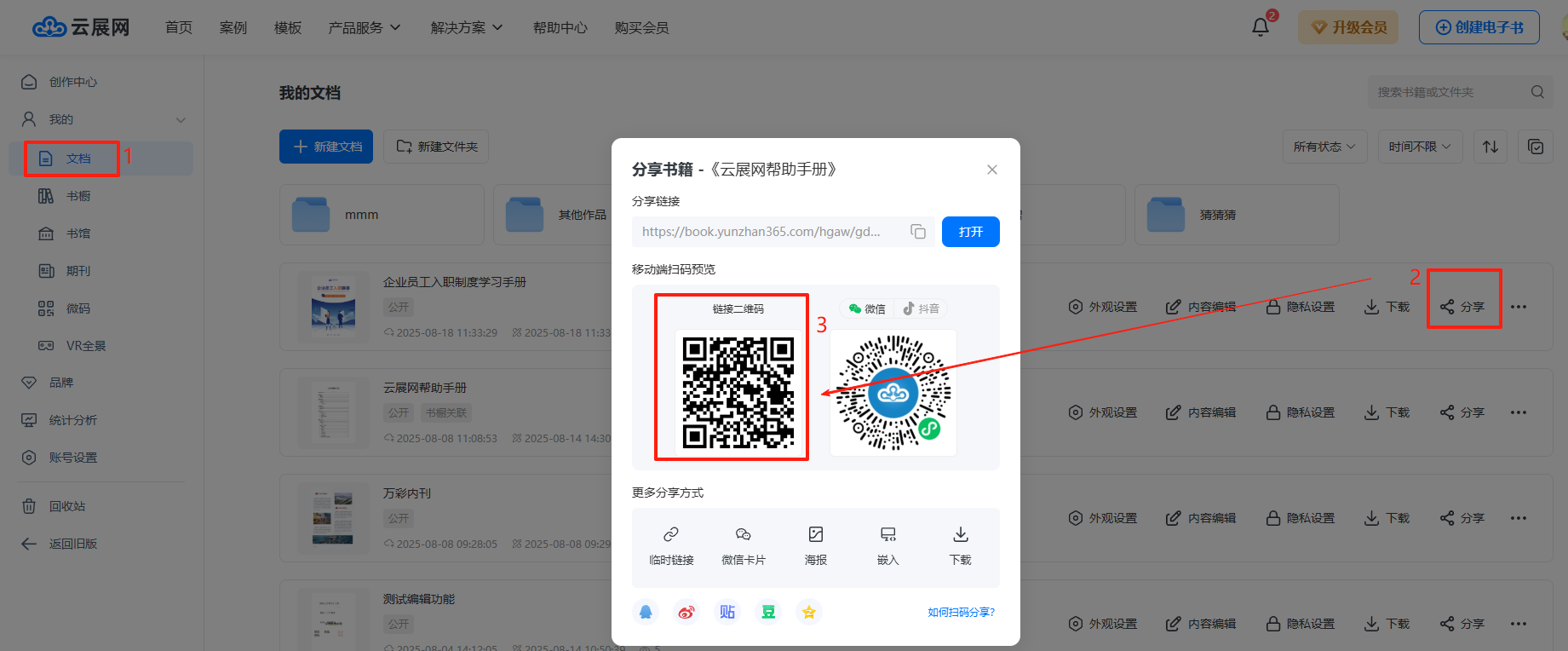 在【文檔】/【書櫥】頁面,點(diǎn)擊【分享】,獲取書籍鏈接二維碼/書櫥二維碼