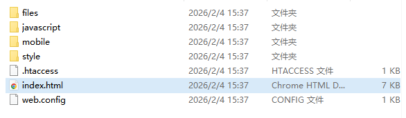 解壓下載的文件,會得到幾個(gè)文件夾、.htaccess文件、web.config文件以及index.html文件,這幾個(gè)文件缺一不可,全部都要上傳到您的網(wǎng)站服務(wù)空間中。