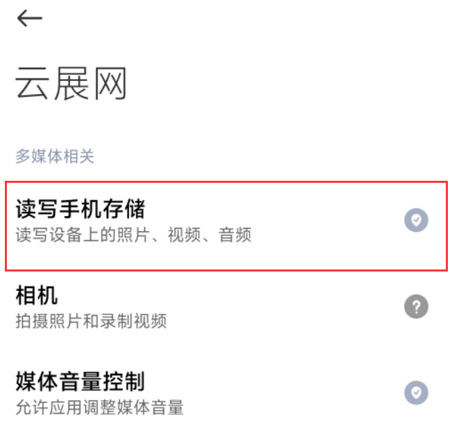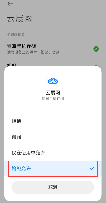 使用云展網(wǎng)app上傳文件/圖片制作時提示權(quán)限不足,可能是手機(jī)未開啟允許云展app讀取存儲訪問權(quán)限,在手機(jī)設(shè)置里開啟權(quán)限即可。