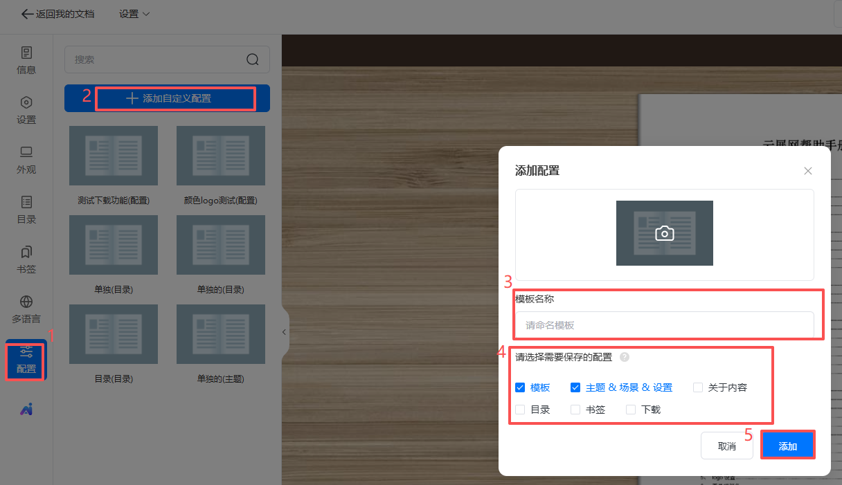 這個功能可以將畫冊設置的工具欄模板、主題、目錄、書簽作為配置保存下來,應用到另一本畫冊上。
