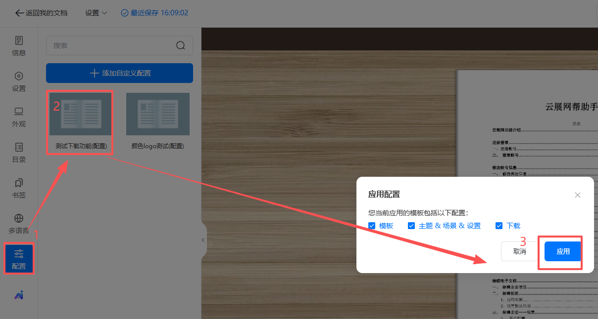 (2)點擊【配置】,單擊保存的配置,點擊【應用】,書本便會應用保存的配置。