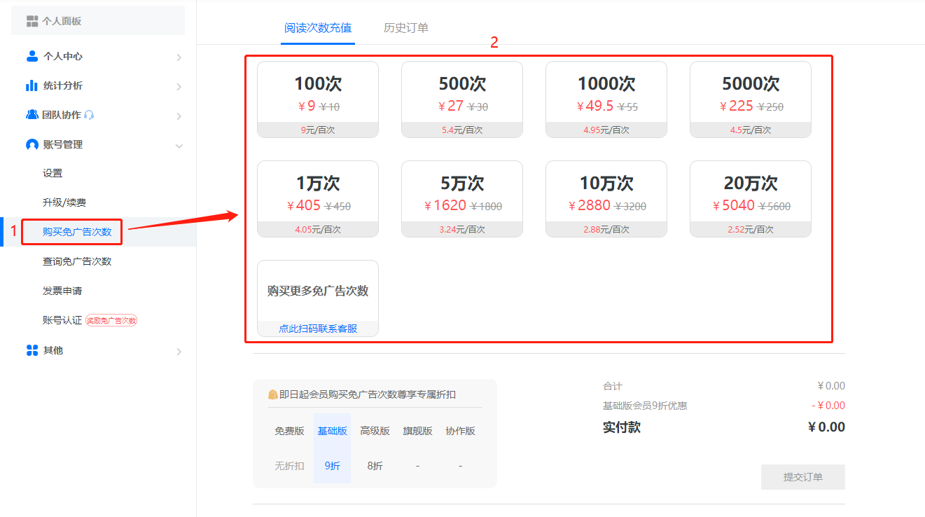 在【賬號管理】點擊【查詢免廣告次數(shù)】,再點擊【查看使用詳情】就可以看到您書本的總免廣告次數(shù)以及剩余的免廣告次數(shù),如下圖: