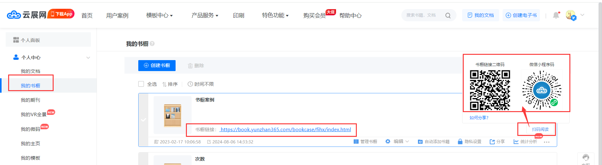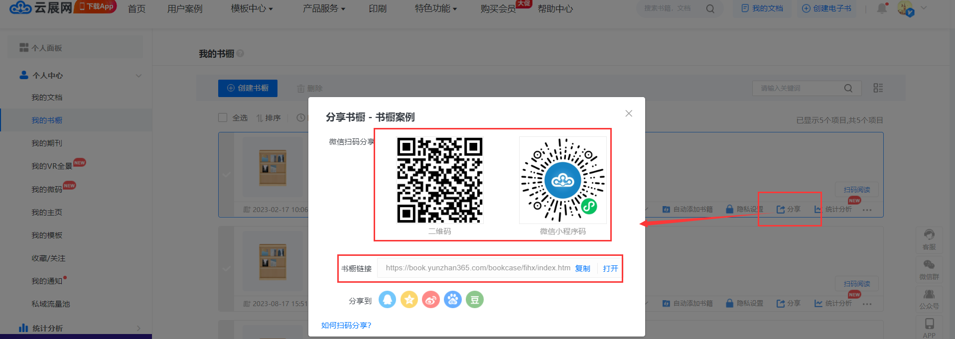 每個(gè)書(shū)櫥都有相應(yīng)的鏈接、二維碼以及小程序碼,在【我的書(shū)櫥】頁(yè)面,創(chuàng)建書(shū)櫥后自動(dòng)生成,如下圖操作,可以查看到書(shū)櫥鏈接、二維碼和小程序碼
