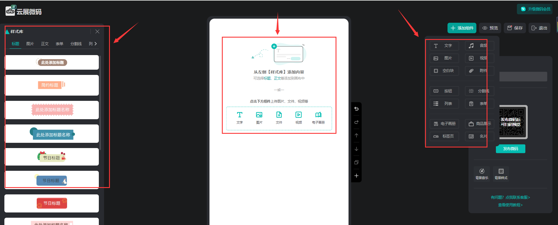 進入編輯器頁面,在頁面上添加圖文、音視頻、附件,設置樣式等內(nèi)容。