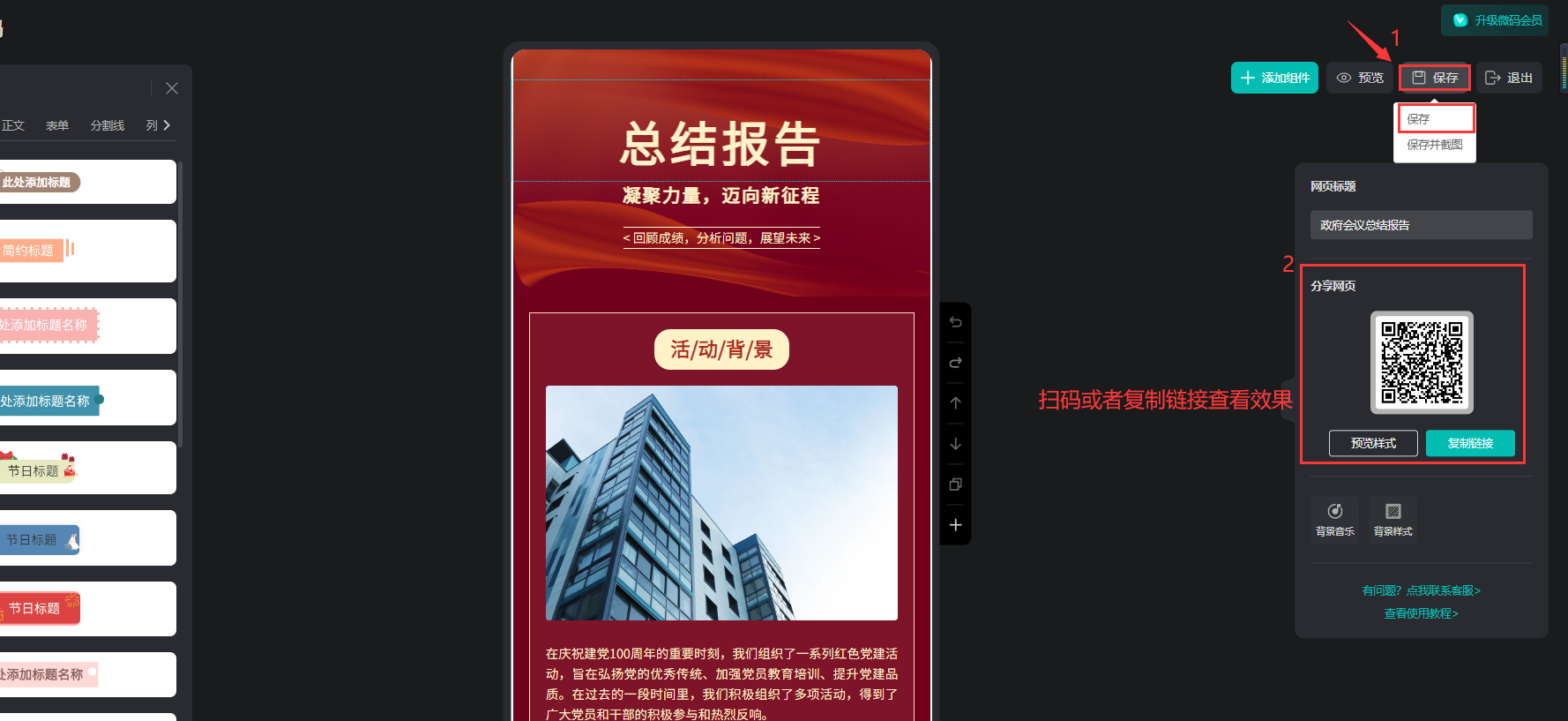 編輯排版好后點擊右上角的【保存】,保存后可以生成微碼鏈接和二維碼分享。