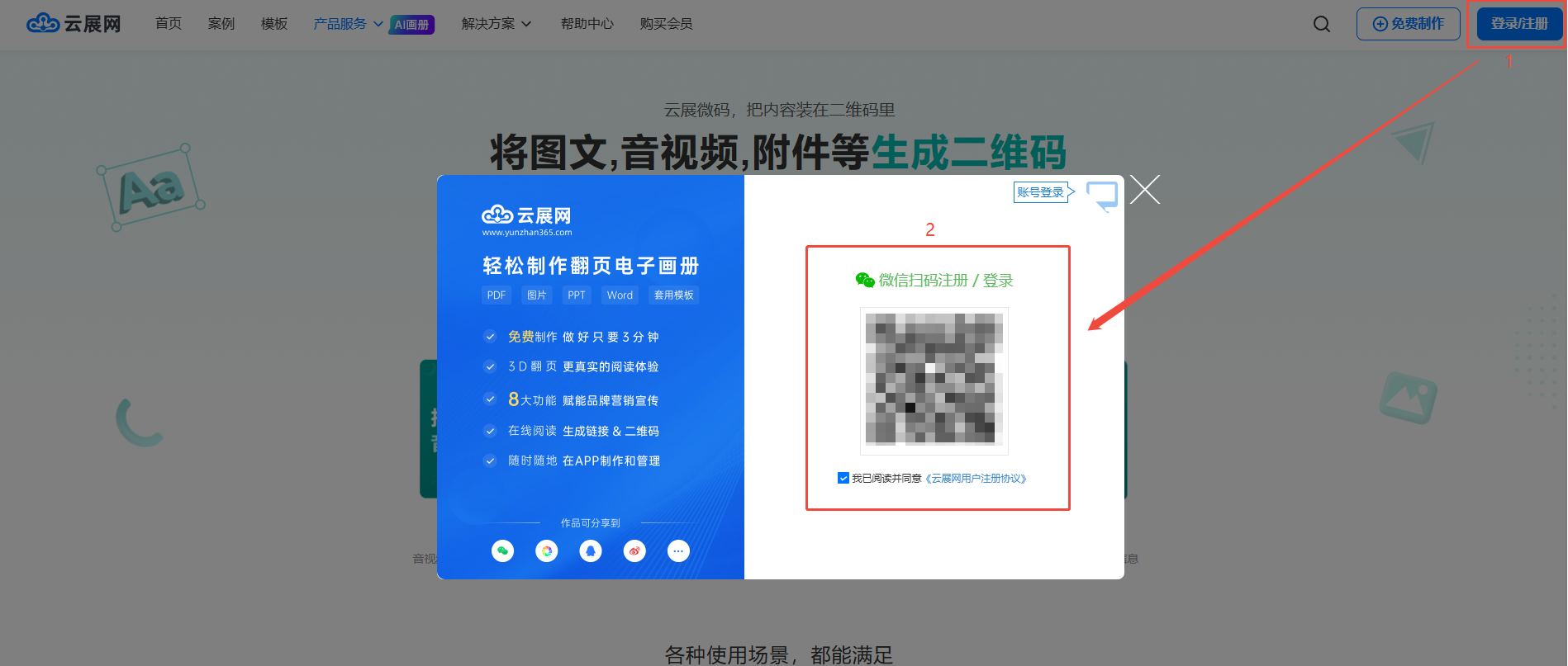 打開云展微碼鏈接,點擊右上角【登錄/注冊】,微信掃碼注冊。