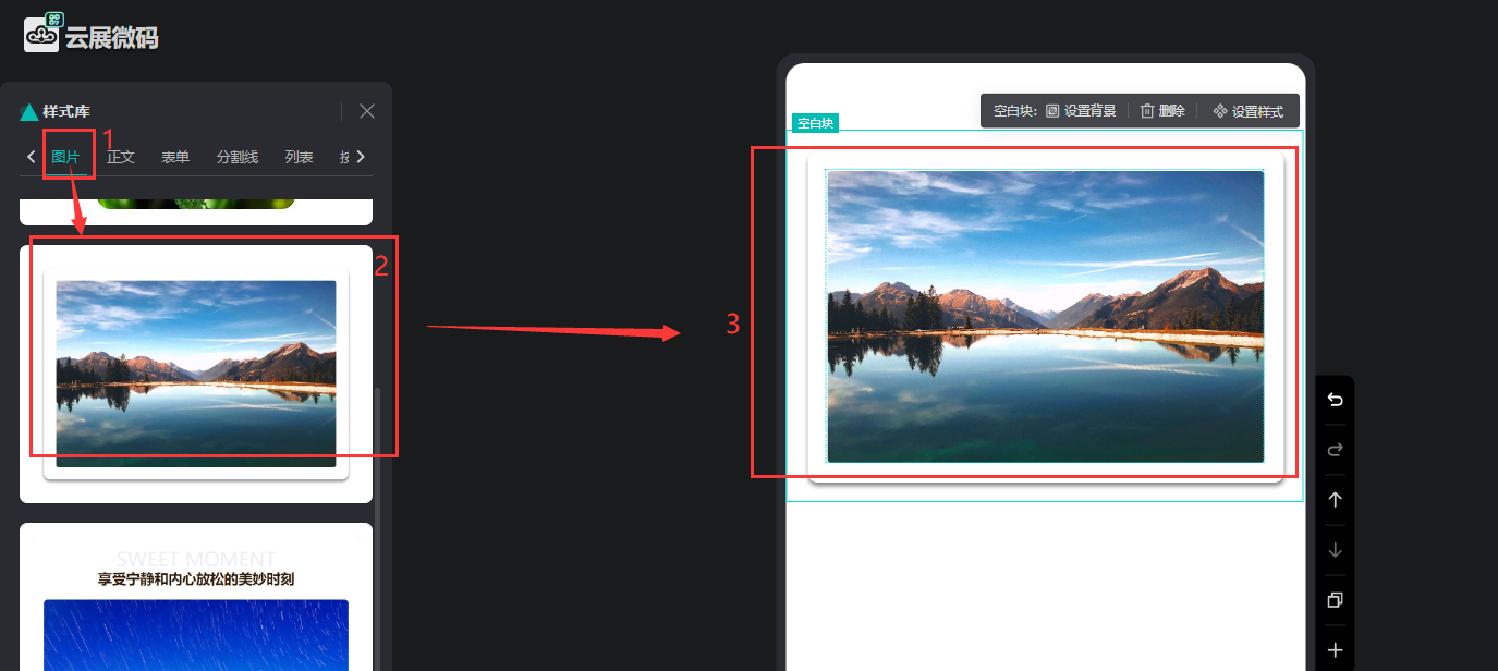 點(diǎn)擊【樣式庫】的【圖片】,選擇一個(gè)樣式,便會(huì)出現(xiàn)在微碼上。