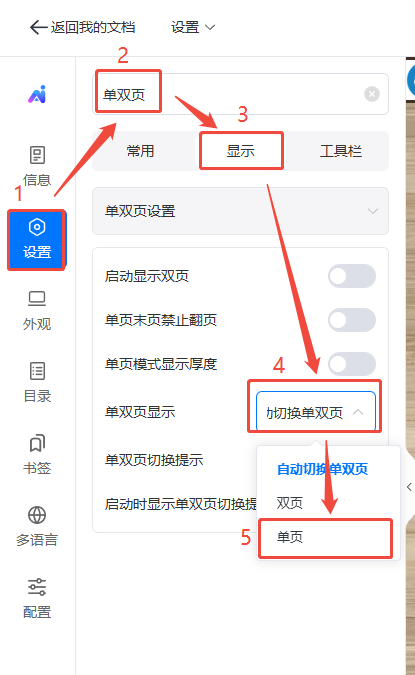 點擊【設置】,上方搜索欄搜索【單雙頁】,【單雙頁顯示】選擇【單頁】后便會自動保存。