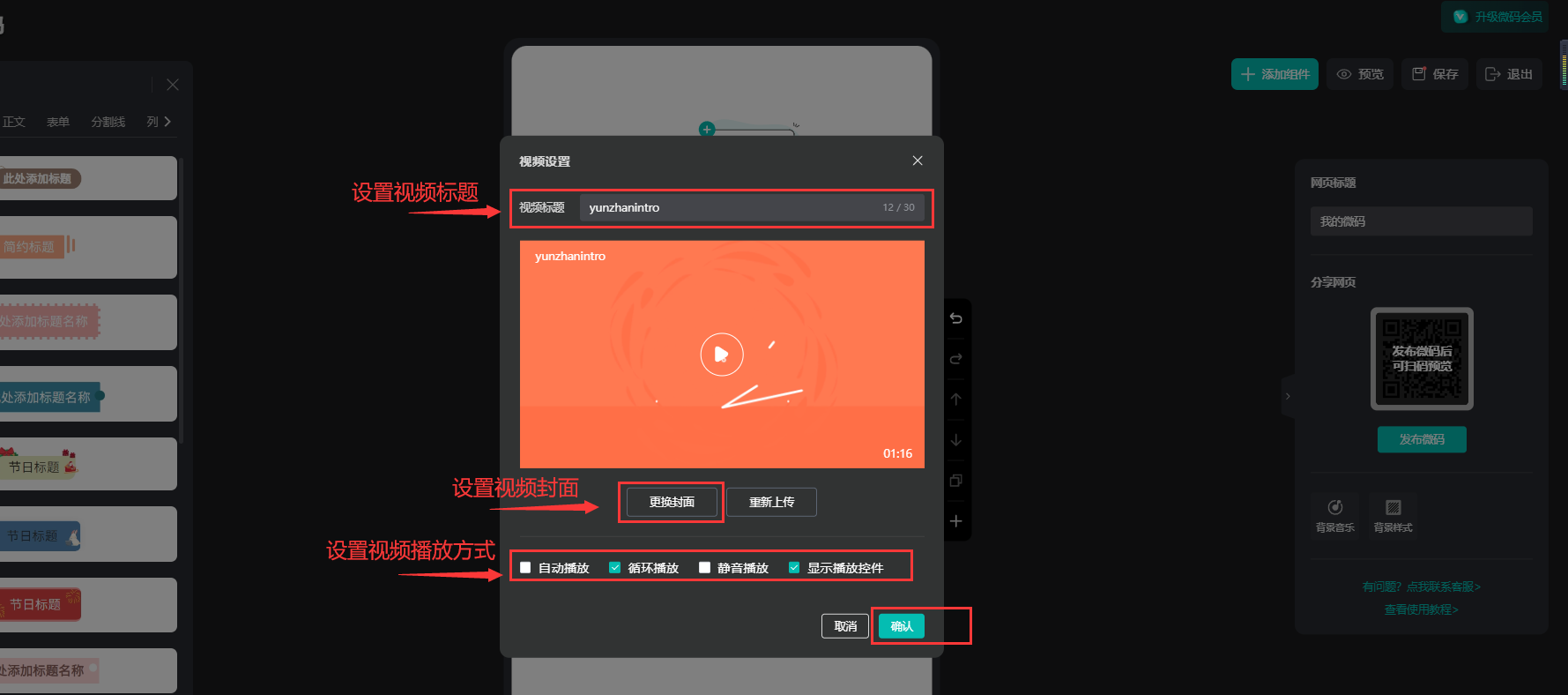 設置視頻標題、封面和播放方式,設置好后點擊【確認】