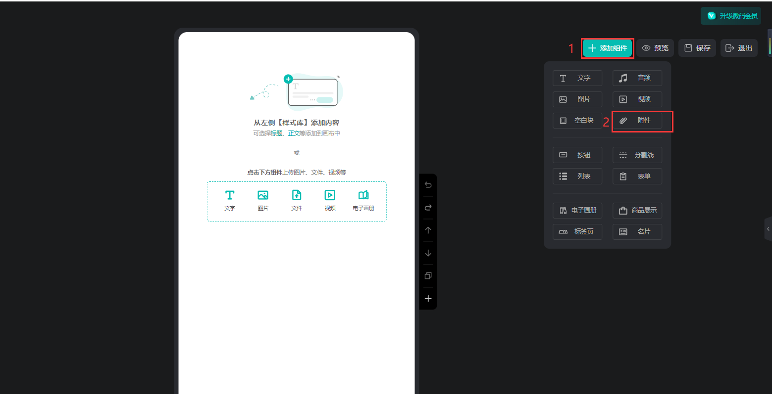 點擊【添加組件】,點擊【附件】,上傳附件(支持pdf、doc、docx、ppt、pptx、mp3、mp4、png、jpg、jpeg.gif、svg、tif、csv、webp、rar、zip等),其他格式可以壓縮成rar/zip上傳