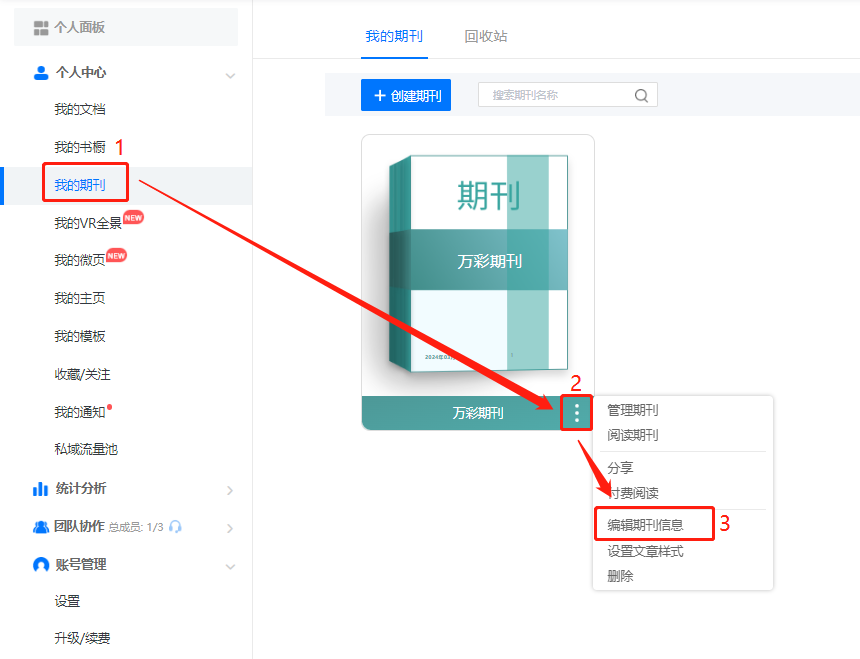 在【我的期刊】中,選擇要操作的期刊,點(diǎn)擊三個(gè)點(diǎn),打開【編輯期刊信息】