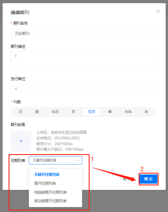 【往期列表】選擇一個(gè)展開方式,如果需要電腦端和移動(dòng)端都展開往期列表,選擇【展開往期列表】即可,最后點(diǎn)擊【確定】即可保存