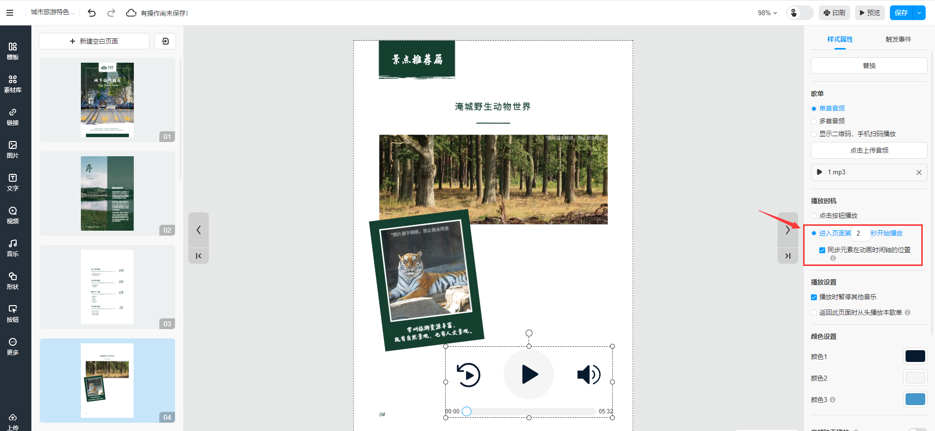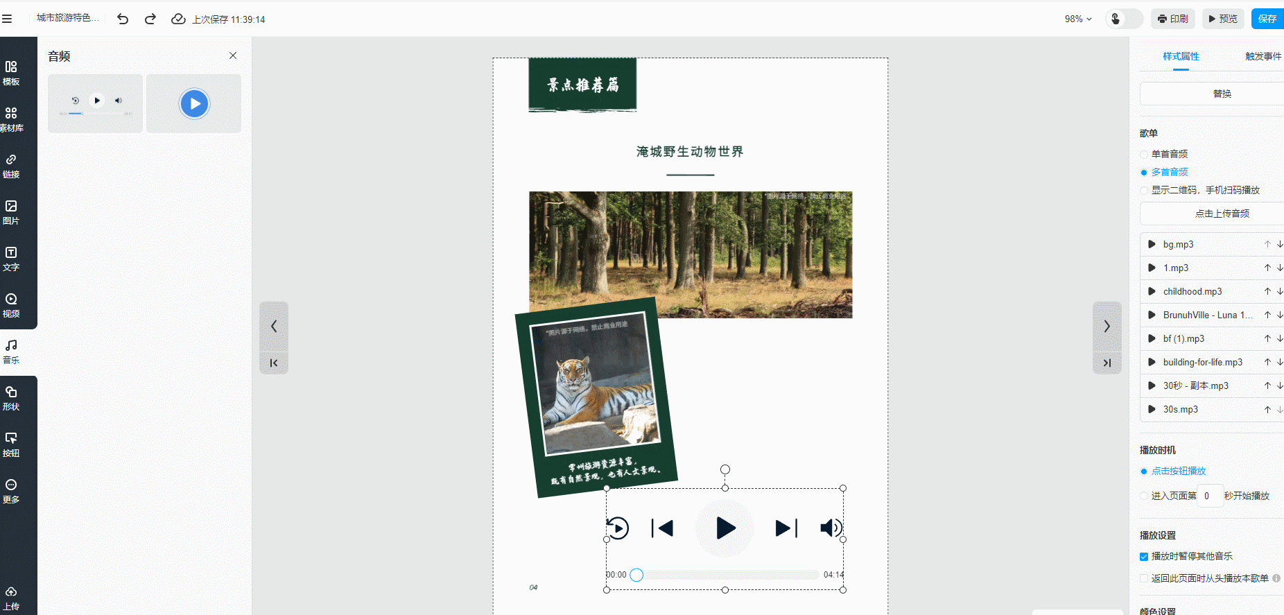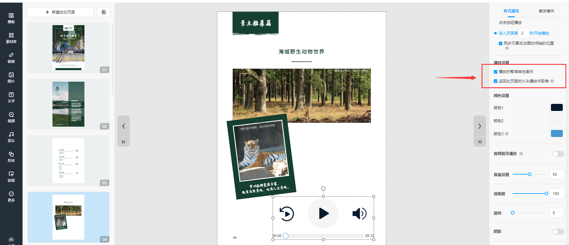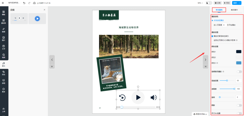 根據(jù)你的需求,在屬性面板中你可以上傳音樂,設(shè)置音樂播放方式,自定義音樂控件的顏色、陰影、位置大小以及旋轉(zhuǎn)。