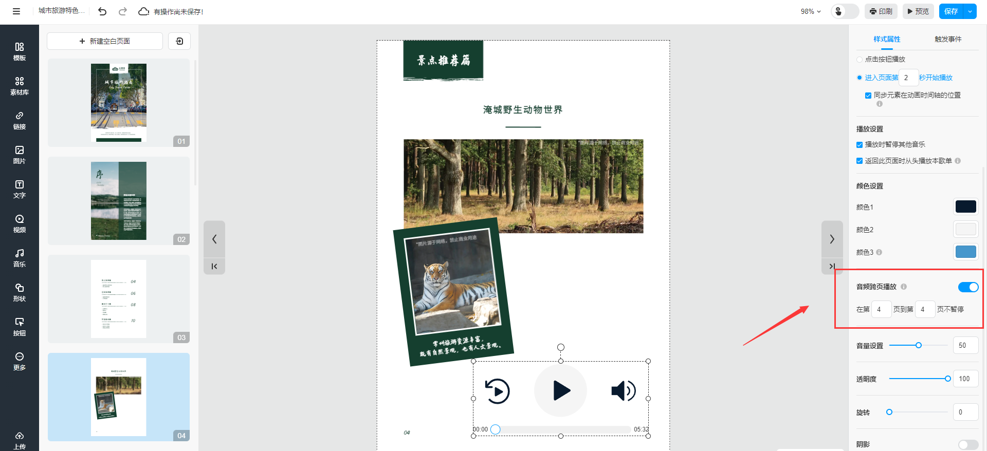 勾選后,根據(jù)你的需求,輸入需要播放音樂的頁(yè)數(shù)范圍,此音頻將在指定頁(yè)數(shù)內(nèi)播放,翻到指定頁(yè)數(shù)外會(huì)自動(dòng)暫停。