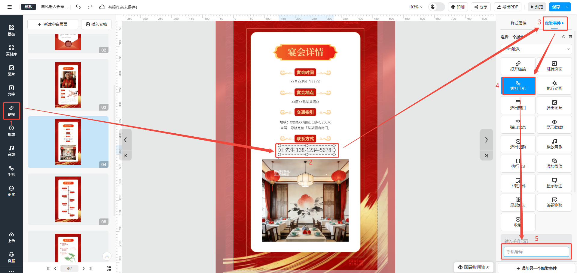 點擊【鏈接】,會出現(xiàn)一個超鏈接框,將超鏈接框覆蓋到電話號碼上,點擊右上角【觸發(fā)事件】,選擇【撥打手機】,下方輸入電話號碼,讀者點擊頁面上的電話號碼就可以直接撥打電話。