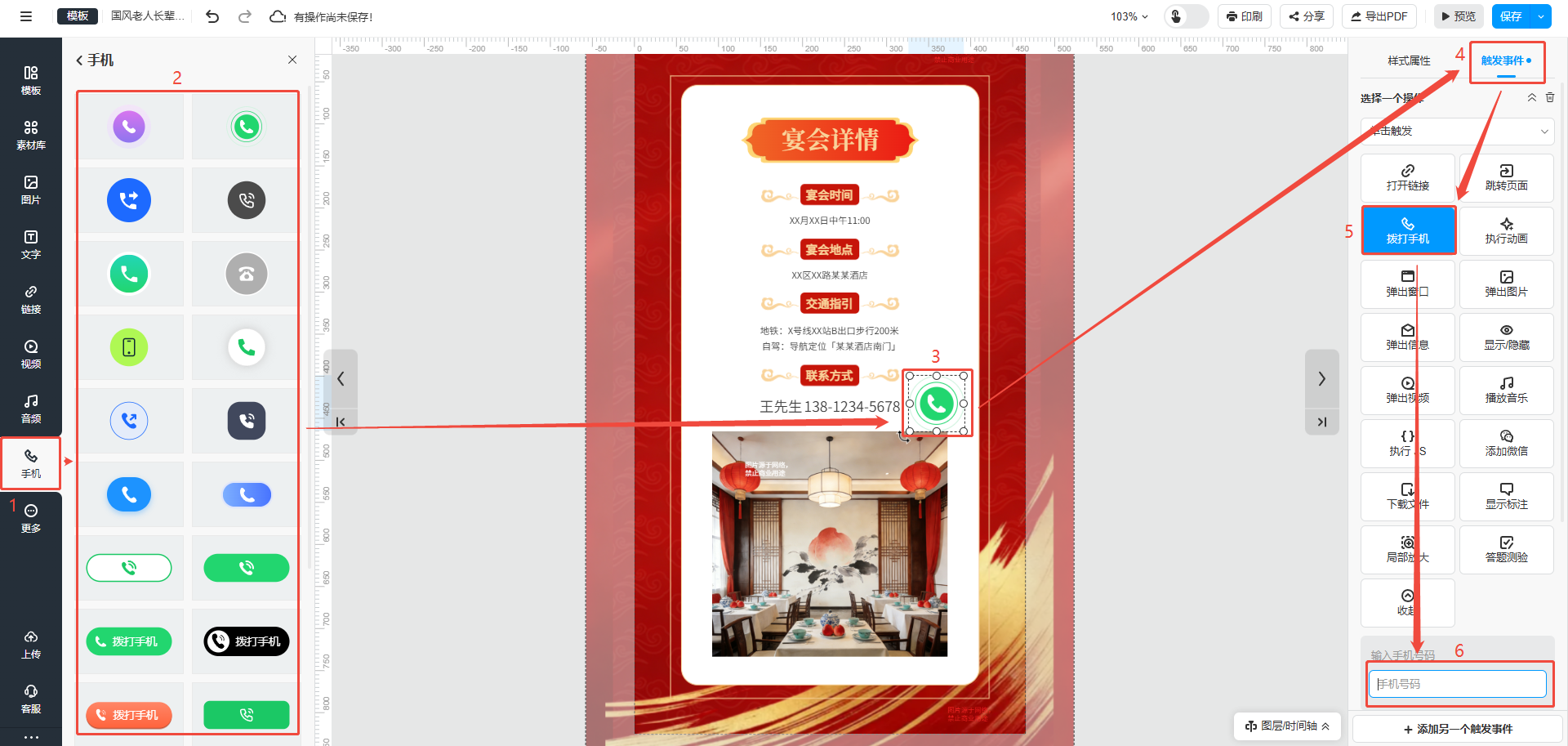 點擊【手機】,選擇一個電話按鈕樣式,就會有一個電話按鈕出現(xiàn)在頁面上,移動到想要的位置上,點擊右上角【觸發(fā)事件】,選擇【撥打手機】,下方輸入電話號碼,讀者點擊頁面上的電話按鈕就可以直接撥打電話。