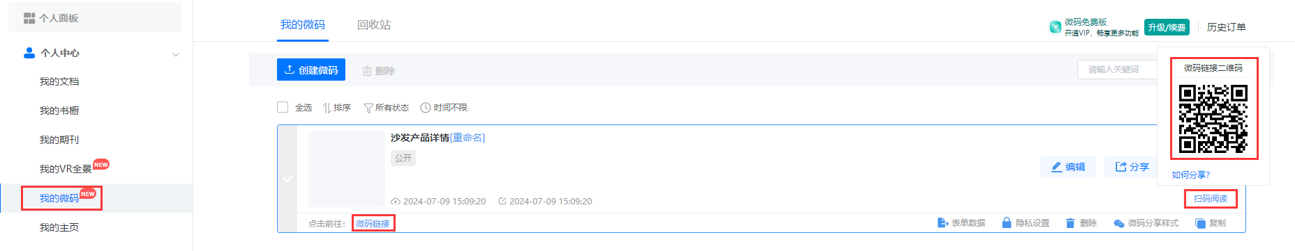(1)點(diǎn)擊【我的微碼】,【微碼鏈接】可以獲取鏈接,【掃碼閱讀】可以獲取二維碼。