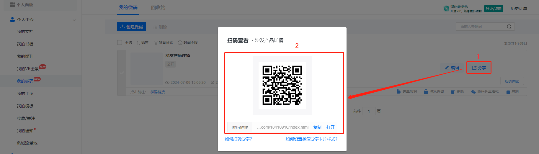 (2)點(diǎn)擊【我的微碼】,然后點(diǎn)擊【分享】,即可獲取鏈接和二維碼。