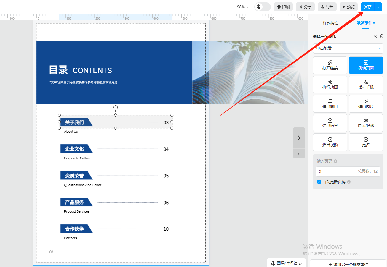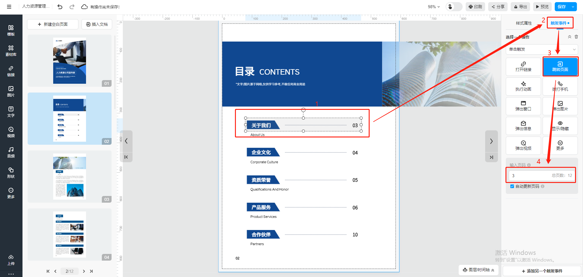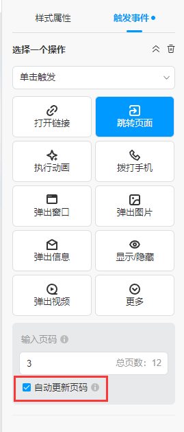 打開【觸發(fā)事件】,【跳轉(zhuǎn)頁面】,設(shè)置需要跳轉(zhuǎn)的頁碼(頁碼從第一頁開始計算)。