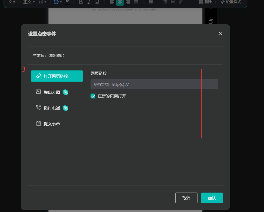 點(diǎn)擊“按鈕”,點(diǎn)擊【添加動作】,可以設(shè)置打開網(wǎng)頁鏈接/彈出大圖/撥打電話/提交表單,設(shè)置好后,點(diǎn)擊【確認(rèn)】