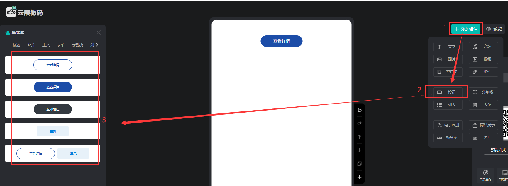 點(diǎn)擊【添加組件】,點(diǎn)擊【按鈕】,選擇左邊的“按鈕“添加到頁面上