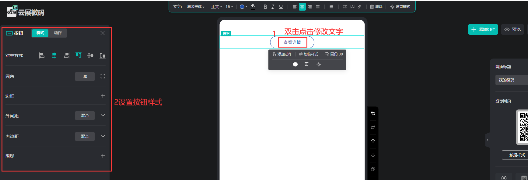 微碼頁面可以添加按鈕,可根據(jù)需要設(shè)置不同的動作屬性滿足您的使用需求,如“撥打電話、提交表單、跳轉(zhuǎn)鏈接、彈出圖片”等。