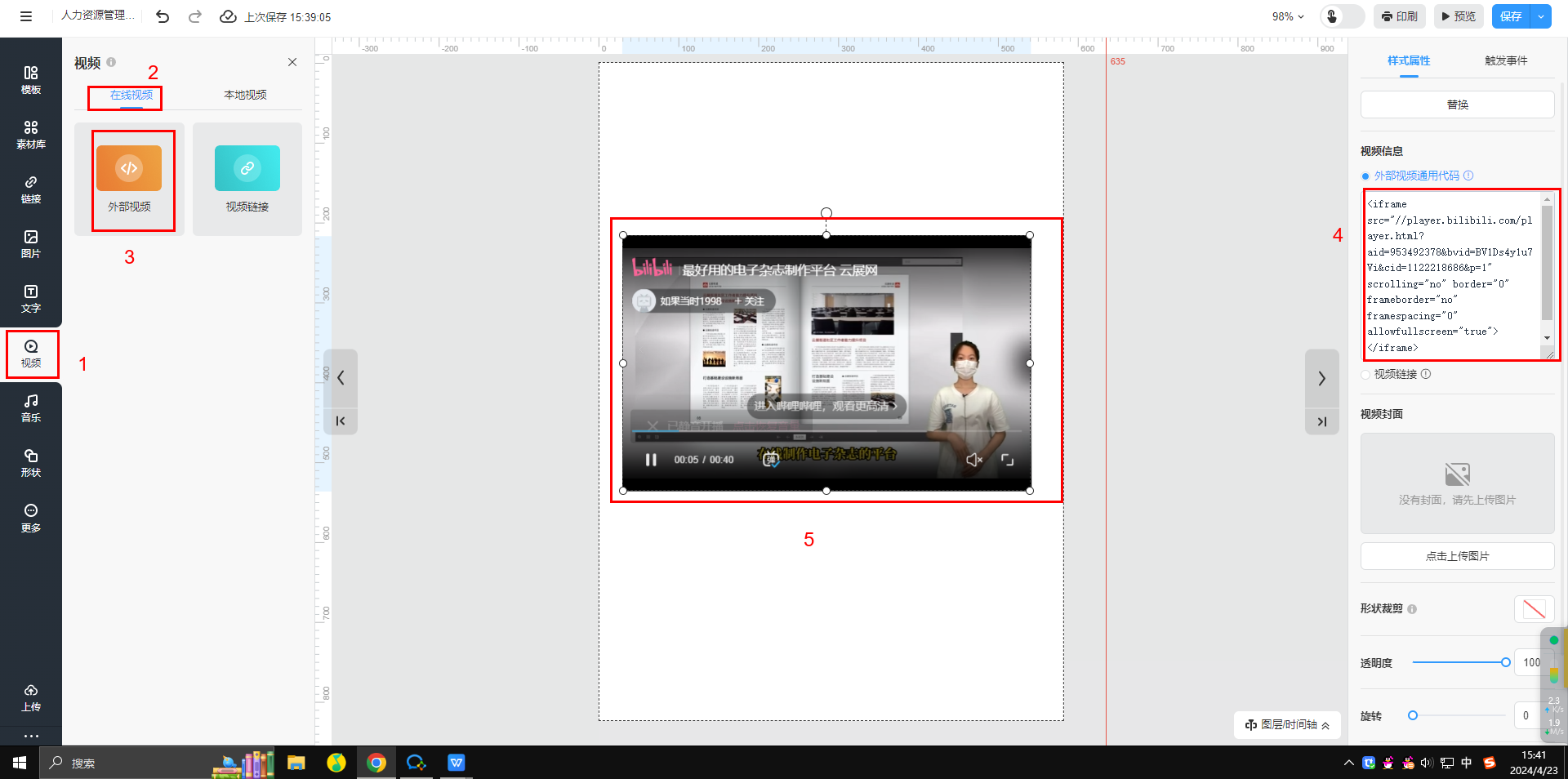 點擊【外部視頻】將視頻框放至畫布,把你的視頻上傳到第三方視頻網(wǎng)站如:bilibili,騰訊,愛奇藝等,上傳以后通過點擊分享來獲取內(nèi)嵌代碼,并輸入到【外部視頻通用代碼】里生成視頻,調(diào)整視頻框的位置和大小。