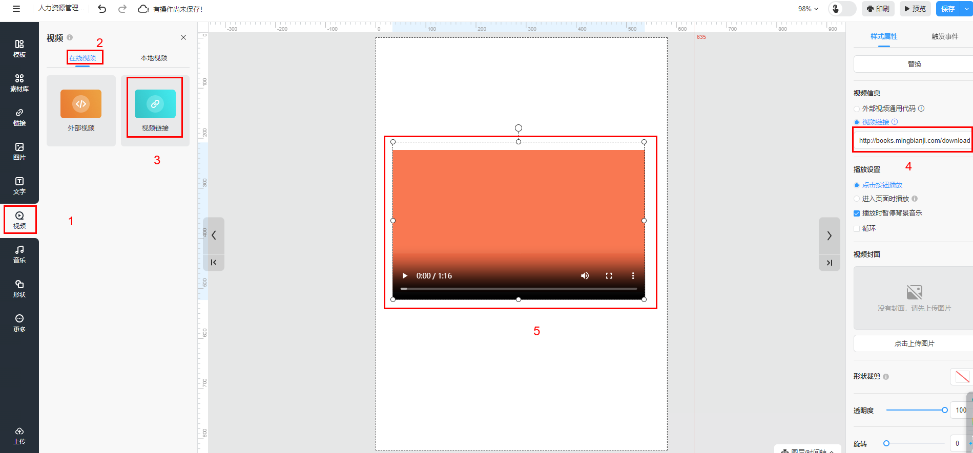 點擊【視頻鏈接】將視頻框放至畫布,調(diào)整視頻框的位置和大小,將你的視頻鏈接輸入到【視頻鏈接】。