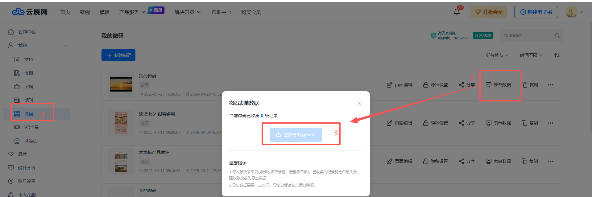 點擊【微碼】,然后點擊【表單數(shù)據(jù)】,最后點擊【全部導(dǎo)出為excel】,即可查看收集到的數(shù)據(jù)